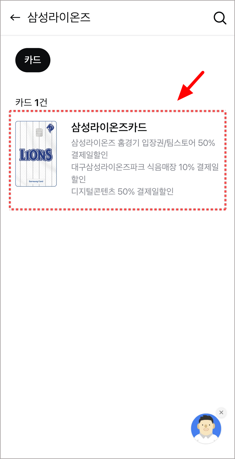 - 상단 검색창에 “삼성라이온즈 카드” 입력
