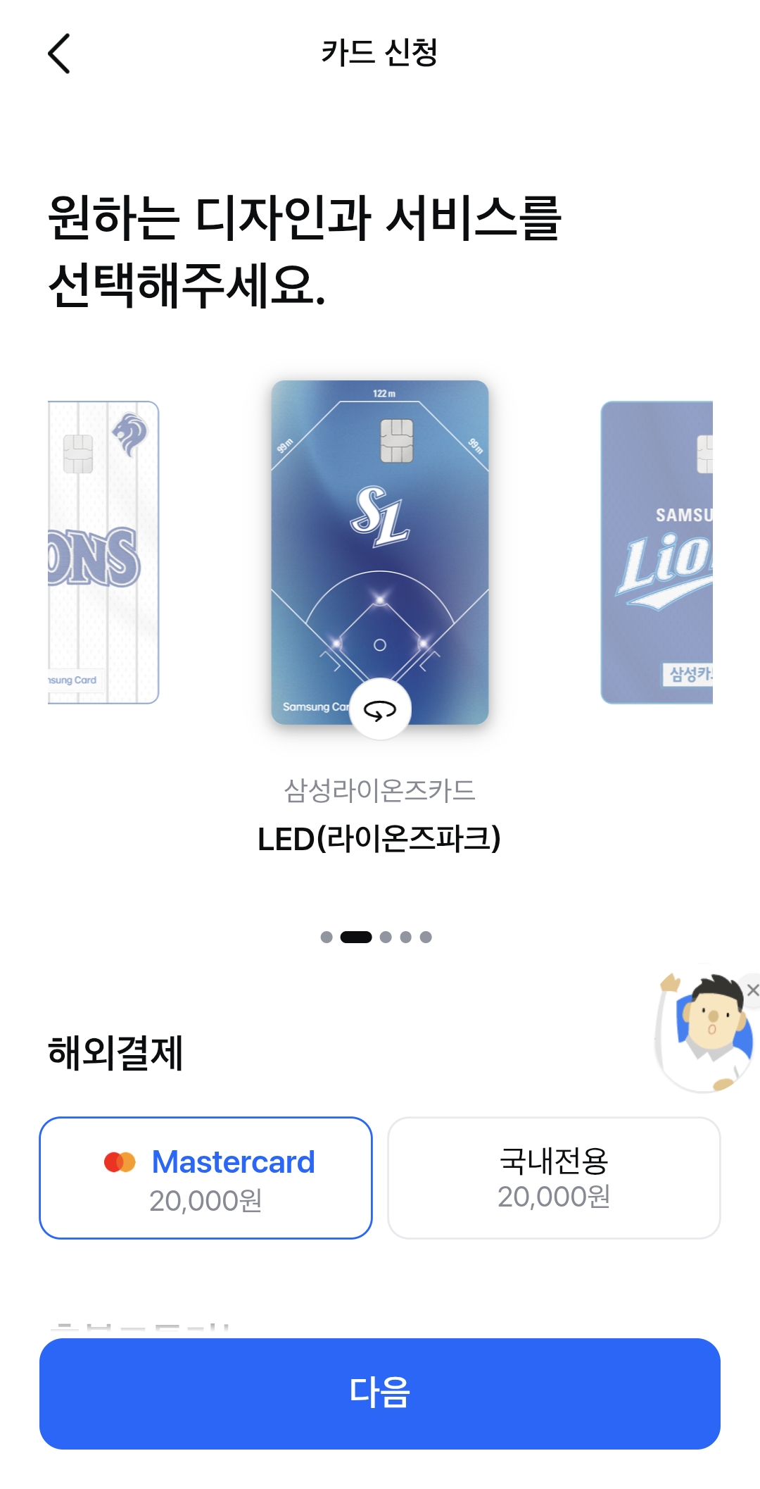 삼성카드 어플에서 라이온즈 신용카드 발급 방법은 아래와 같습니다.