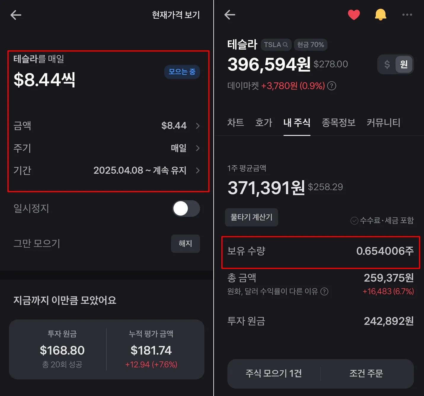 2025년 5월 7일 기준, 1주에 277달러인 테슬라(TSLA) 주식을 매일 8.4달러씩 사고 있죠.